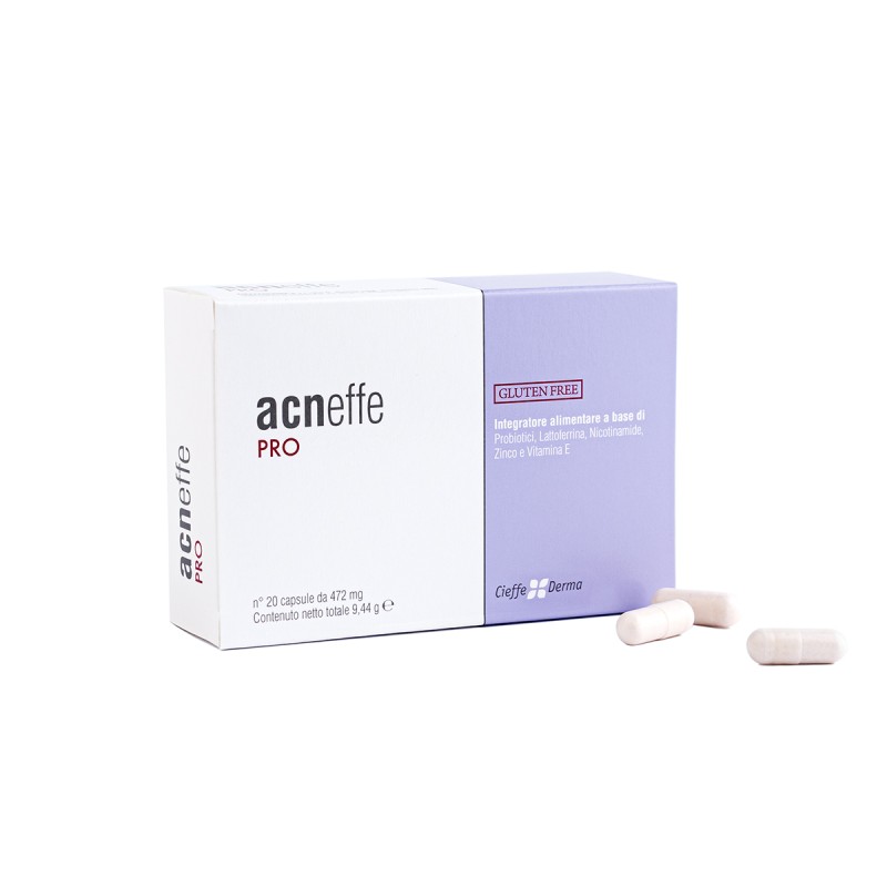 ACNEFFE PRO is a supplement based on probiotics (L. rhamnosus SP1) that help promote the balance of the intestinal flora. Nicotinamide contributes to the maintenance of normal skin, helping to regulate sebum production; Lactoferrin counteracts the proliferation of acne causing bacteria and protects against oxidative stress; Zinc and Vitamin E inhibit the formation of additional free radicals, which could worsen skin conditions.